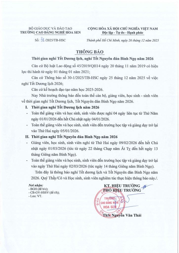Thông báo lịch nghỉ Tết Nguyên đán Bính Ngọ 2026